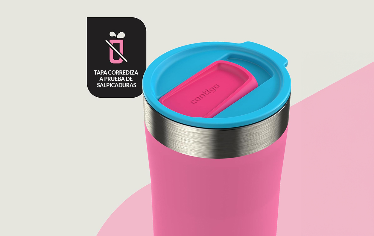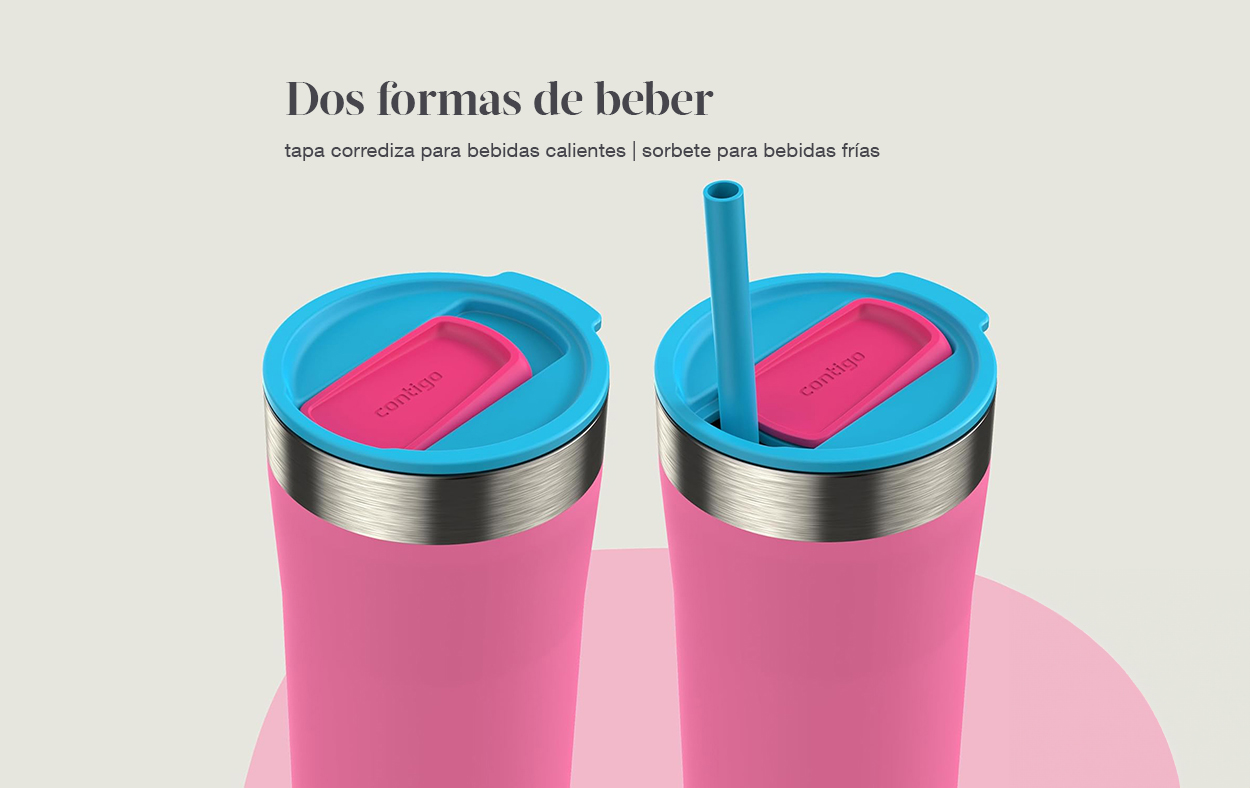 Dos formas de beber: sorbete de polietileno para bebidas frías y tapa corrediza incorporada para beber bebidas calientes. Tapa a prueba de salpicaduras cuando está cerrada.