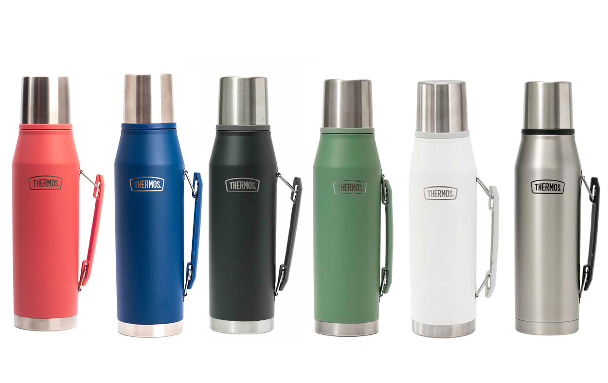 Termo de acero inoxidable con doble aislamiento térmico que manteniene los líquidos fríos o calientes durante horas. Con pico vertedor y cierre hermético, que evita derrames.