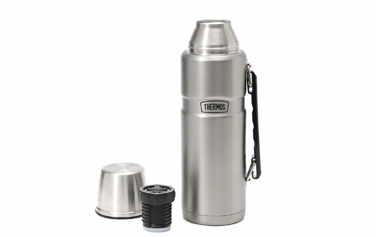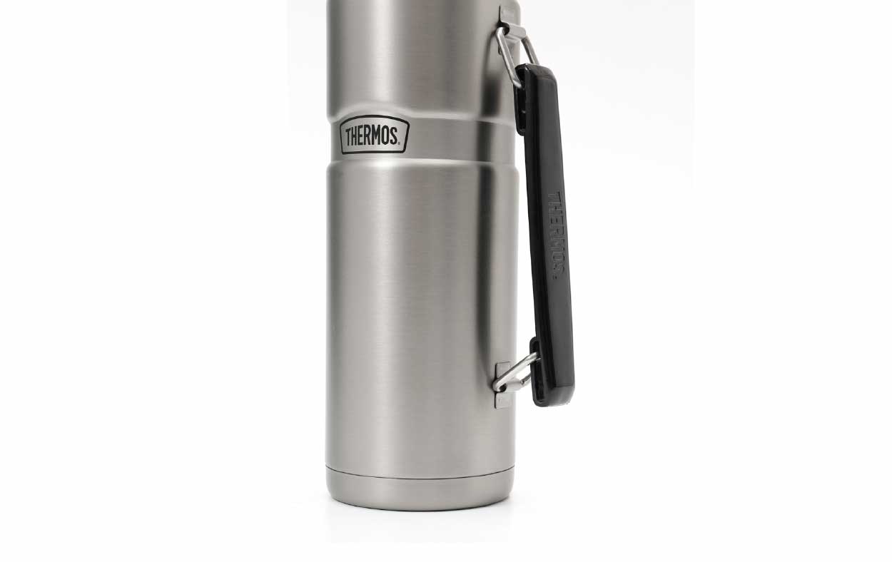 Termo con vaso para servir que funciona como tapa. Cuenta con tapón giratorio que permite verter fácilmente y sella herméticamente. Mantiene tanto el calor como el frío por 24hs. Con asa de agarre.